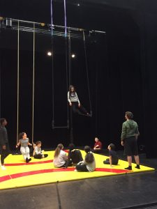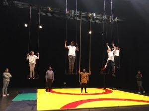Le dernier jour ils ont mis à profit tout ce qu’ils ont appris pendant la semaine en mettant à l’honneur les images réalisées dernièrement par les 5C. En effet, les images et trucages étaient projetés sur les élèves pendant qu’ils exécutaient des figures sur les trapèzes.